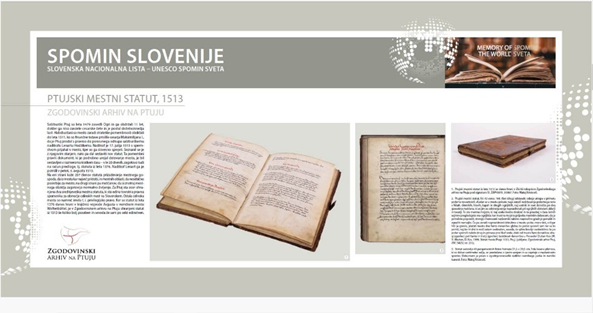 Ogled razstave na prostem – ptujska mestna tržnica, z naslovom »Spomin Slovenije. Slovenska nacionalna lista – UNESCO Spomin sveta«, pripravil Nacionalni odbor Spomin sveta. Predstavljene in izbrane enote simbolično prikazujejo nekatere najpomembnejše mejnike najzgodnejšega in poznejšega razvoja slovenske kulture in naroda. Med prvo deseterico enot dokumentarne dediščine je predstavljen Statut mesta Ptuja iz leta 1513. Kot zadnji, vendar pomensko zelo močan dokaz dokumentarne dediščine 20. stoletja je opomin na grozote 2. svetovne vojne predstavljen Kobetov »Taboriščni tarok« iz leta 1945, ki v skladu z Unescovimi načeli miru, sporoča, naj se grozodejstva ne ponovijo.